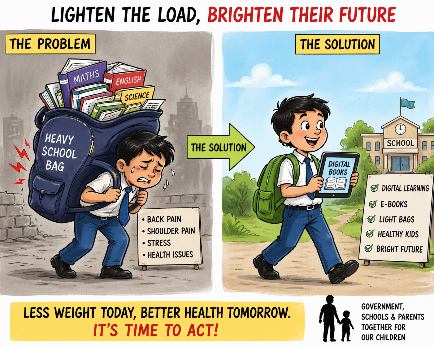 This growing concern demands immediate attention from both educational institutions and authorities. In many countries, digital learning tools and e-books have significantly reduced the physical burden on students. Similar measures can be adopted here, such as introducing e-books or designating certain days when children are not required to carry full school bags.