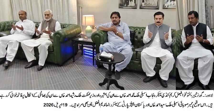 LAHORE: Governor Khyber Pakhtunkhwa Faisal Karim Kundi visited the residence of Speaker Punjab Assembly Malik Muhammad Ahmad Khan at Khai Hattar.