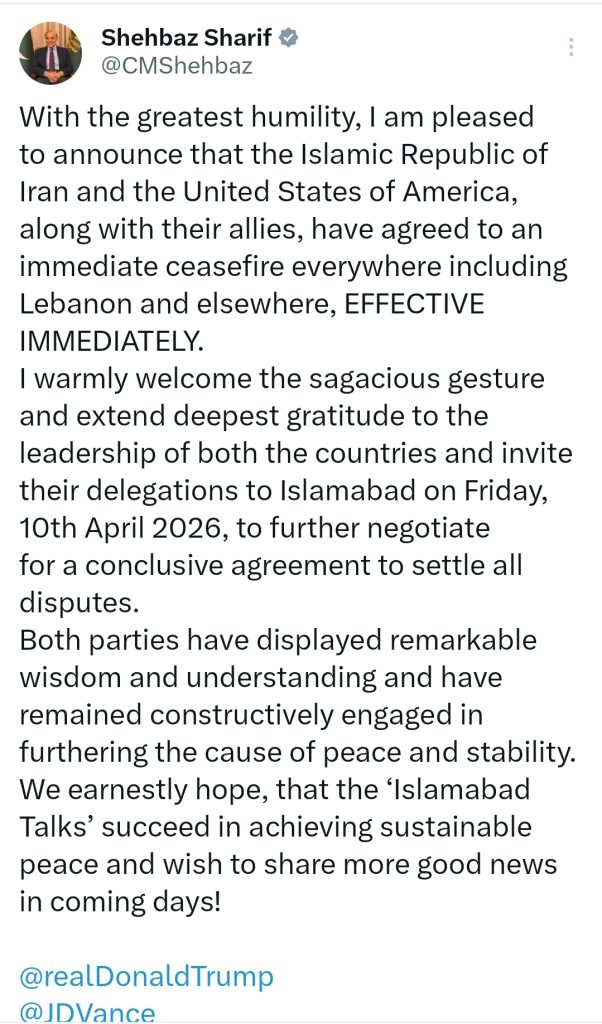 ISLAMABAD (News Desk) April 08 — Pakistan on Wednesday announced that the Islamic Republic of Iran and the United States, along with their allies, had agreed to an immediate ceasefire, including in Lebanon, and invited their delegations to Islamabad on April 10 for negotiations aimed at a lasting resolution.