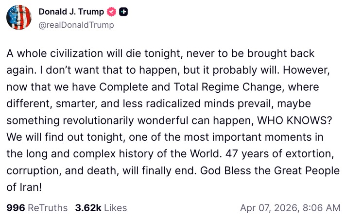 Former US President Donald Trump posted an alarming warning on Truth Social, claiming that “a whole civilisation will die tonight” if Iran fails to make a deal, sparking global concern and criticism for provocative rhetoric.
