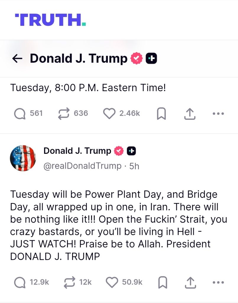 In a social media post, Trump declared that Tuesday would be “Power Plant Day” and “Bridge Day” in Iran, signaling potential strikes on critical facilities.