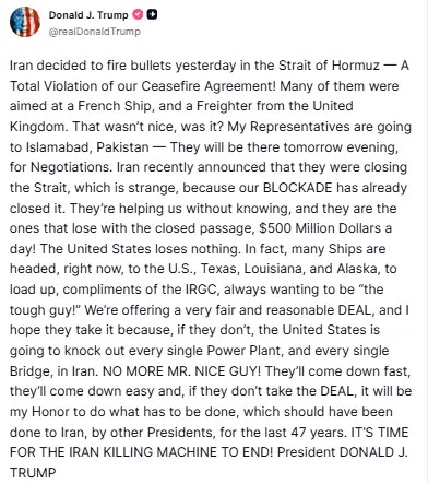 In a post on Truth Social, Trump said US representatives were heading to Pakistan and would arrive “tomorrow evening for negotiations”, adding that Washington had offered Tehran what he described as a “very fair and reasonable” deal. He warned of severe consequences if Iran rejected the proposal, including potential strikes on key infrastructure.